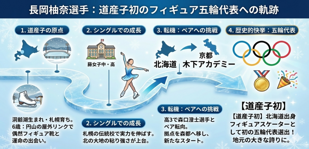 長岡選手は、フィギュアスケートの五輪代表として北海道出身者初(道産子初)という歴史的な快挙を成し遂げました。